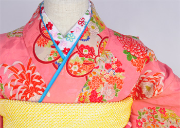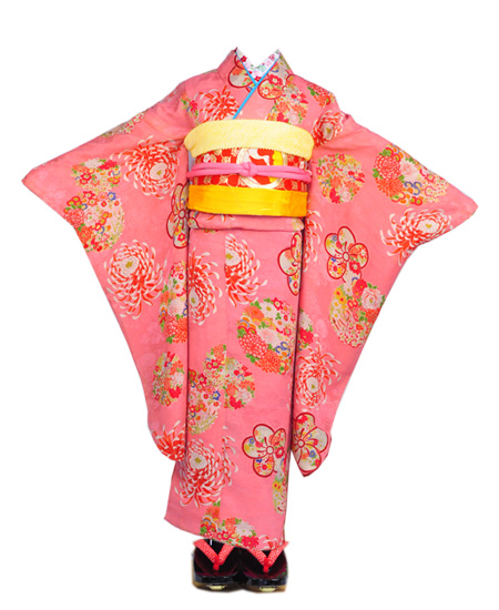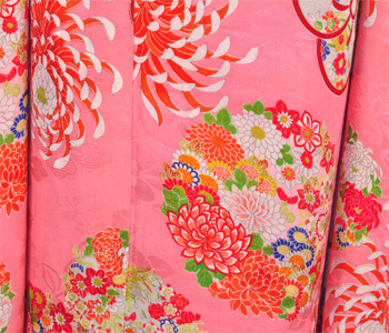鮮やかな桃色の地色に、菊がたくさん描かれた大きな丸紋が染められています。 勢いのあるリアルな乱菊と、文様化された梅の対比が面白いですね。 着るだけで昔のお嬢様になれそうな、かわいいお着物です。