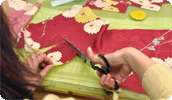 おはりばこが扱う古布は、着物の状態から仕入れます。丁寧に解き、アイロンを掛け、柄の配置を考え、汚れを避けて、型紙を当てて。それから初めてハサミを入れます。柄取りには、職人のこだわりが見え隠れしますので、よくご覧ください。